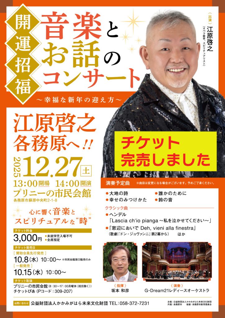 チケット完売しました!!12月27日(土)「開運招福 音楽とお話のコンサート~幸福な新年の迎え方~」