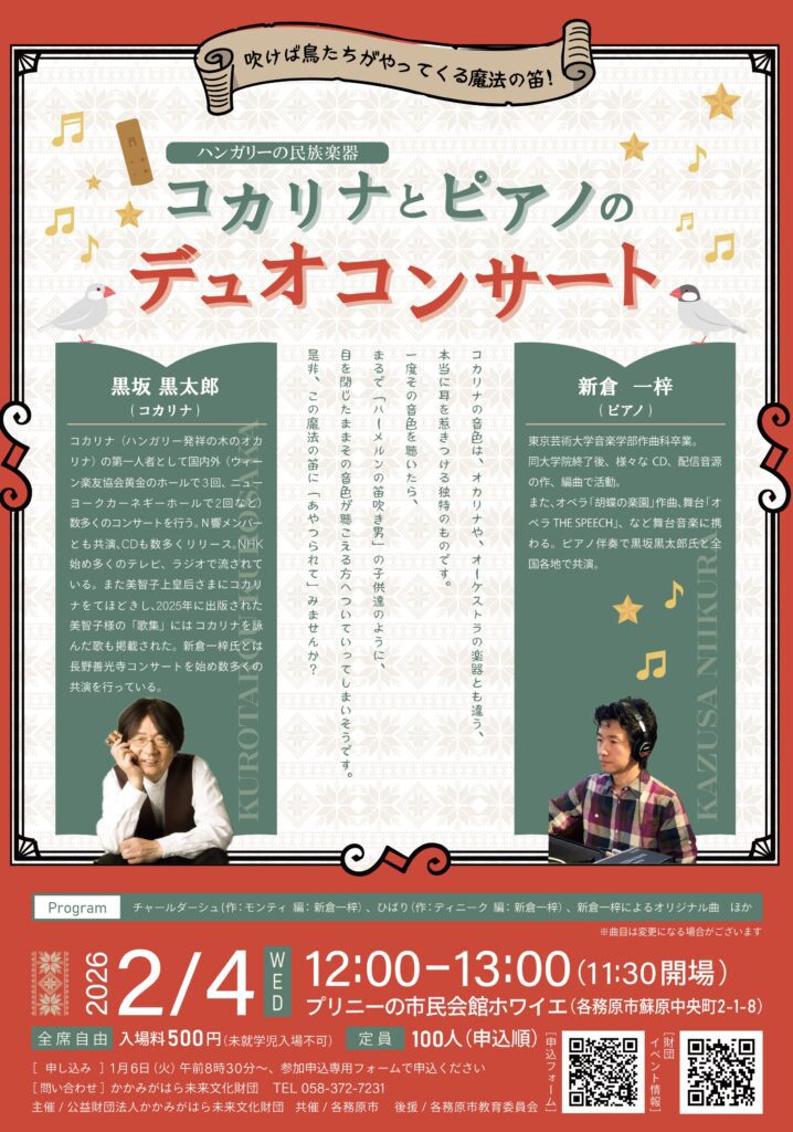 幅広い世代の皆さんに、気軽に音楽に親しんでいただくためコンサートを開催します。ぜひお友達やご家族など、お誘いあわせの上ご参加ください! ハンガリーの民族楽器コカリナとピアノのデュオコンサート 吹けば鳥たちがやってくる魔法...