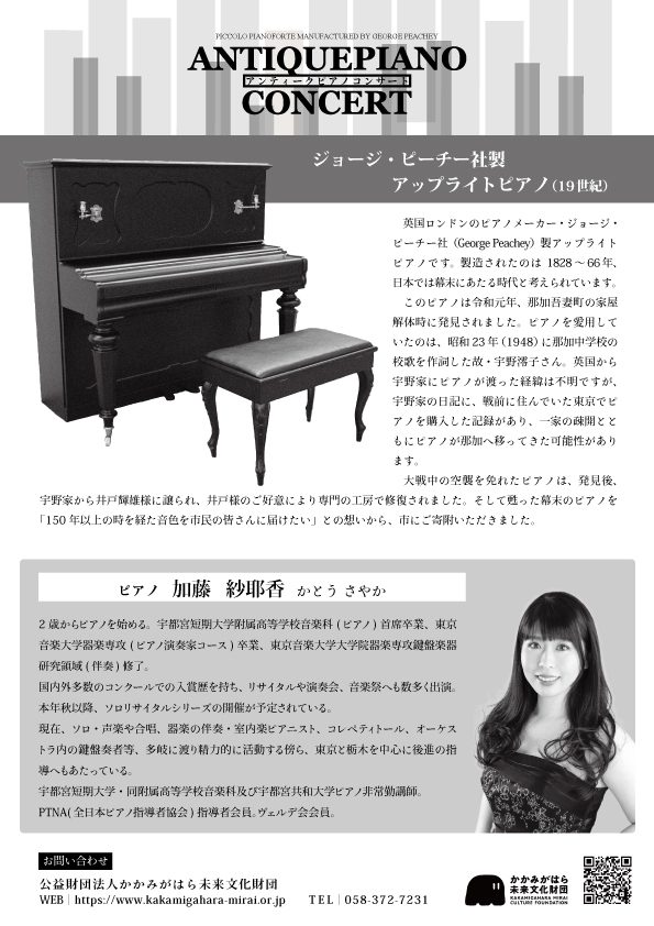 ピアノを調べてみると、1828~66年ごろに英国ロンドンでピアノを製造していた「ジョージ・ピーチー社」製のアップライトピアノで、150年以上前に製作され、戦前に各務原へ渡ってきたことがわかりました。修理が必要だったピアノは、市民のご厚意により修復され、「150年以上の時を経た音色を市民の皆さんに届けたい」との想いから、2023年11月に各務原市に寄附されました。