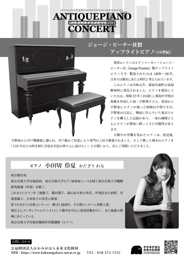 ピアノを調べてみると、1828~66年ごろに英国ロンドンでピアノを製造していた「ジョージ・ピーチー社」製のアップライトピアノで、150年以上前に製作され、戦前に各務原へ渡ってきたことがわかりました。修理が必要だったピアノは、市民のご厚意により修復され、「150年以上の時を経た音色を市民の皆さんに届けたい」との想いから、2023年11月に各務原市に寄附されました。