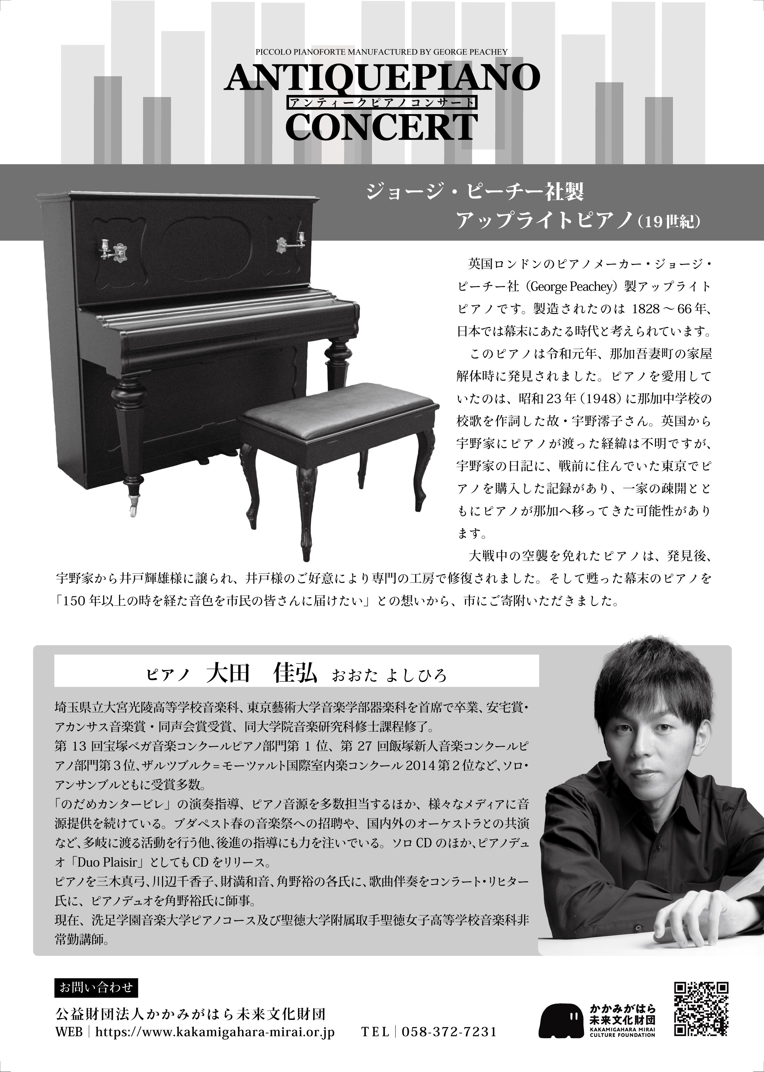 ピアノを調べてみると、1828~66年ごろに英国ロンドンでピアノを製造していた「ジョージ・ピーチー社」製のアップライトピアノで、150年以上前に製作され、戦前に各務原へ渡ってきたことがわかりました。修理が必要だったピアノは、市民のご厚意により修復され、「150年以上の時を経た音色を市民の皆さんに届けたい」との想いから、2023年11月に各務原市に寄附されました。